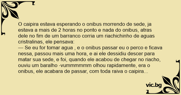 O caipira estava esperando o onibus morrendo de sede, ja estava a mais de 2 horas no ponto e nada do onibus, atras dele no fim de um barranco corria um riachichinho de aguas cristralinas, ele pensava: