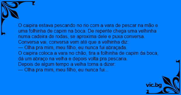 O caipira estava pescando no rio com a vara de pescar na mão e uma folhinha de capim na boca. De repente chega uma velhinha numa cadeira de rodas, se aproxima dele e puxa conversa.