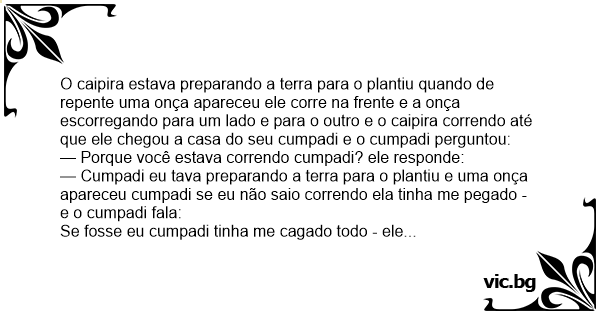 O caipira estava preparando a terra para o plantiu quando de repente uma onça apareceu ele corre na frente e a onça escorregando para um lado e para o outro e o caipira correndo até que ele chegou a casa do seu cumpadi e o cumpadi perguntou: