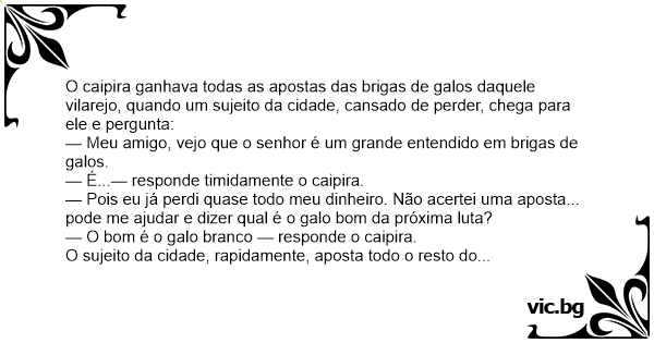 O caipira ganhava todas as apostas das brigas de galos daquele vilarejo, quando um sujeito da cidade, cansado de perder, chega para ele e pergunta: