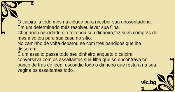 É um assalto,passe todo seu dinheiro enquato o caipira conversava com os assaltantes,sua filha que se encontrava no banco de tras do jeep, escondia todo o dinheiro que restara na sua vаginа os assaltantes todo revoltados manda o caipira e sua filha descer do jeep e tirar as suas roupas os assaltantes de posse do que queriam vão embora deixando o caipira e sua filha nús na estrada o caipira nú sentado na beira da estrada recramava para sua filha: