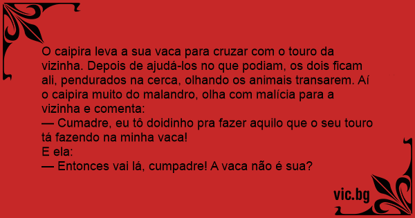 O caipira leva a sua vаса para cruzar com o touro da vizinha. Depois de ajudá-los no que podiam, os dois ficam ali, pendurados na cerca, olhando os animais transarem. Aí o caipira muito do malandro, olha com malícia para a vizinha e comenta:
