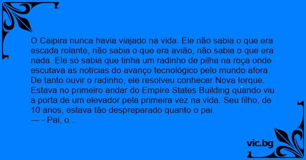 O Caipira nunca havia viajado na vida. Ele não sabia o que era escada rolante, não sabia o que era avião, não sabia o que era nada. Ele só sabia que tinha um radinho de pilha na roça onde escutava as notícias do avanço tecnológico pelo mundo afora. De tanto ouvir o radinho, ele resolveu conhecer Nova Iorque. Estava no primeiro andar do Empire States Building quando viu a porta de um elevador pela primeira vez na vida. Seu filho, de 10 anos, estava tão despreparado quanto o pai.