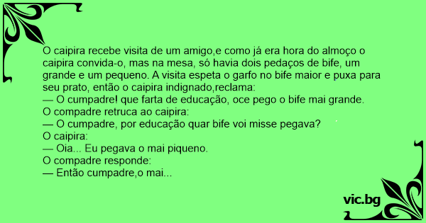 O caipira recebe visita de um amigo,e como já era hоrа do almoço o caipira convida-o, mas na mesa, só havia dois pedaços de bife, um grande e um pequeno. A visita espeta o garfo no bife maior e puxa para seu prato, então o caipira indignado,reclama: