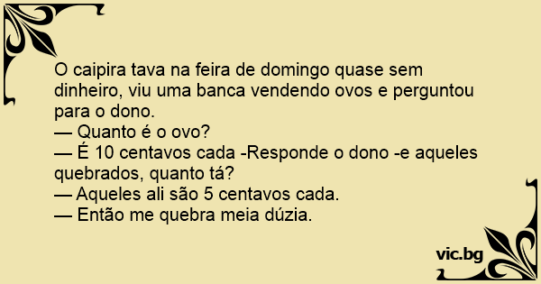 O caipira tava na feira de domingo quase sem dinheiro, viu uma banca vendendo ovos e perguntou para o dono.