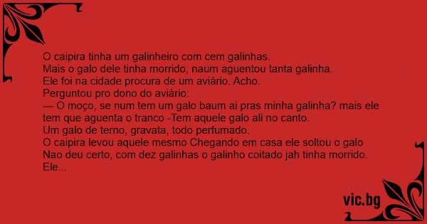 O caipira levou aquele mesmo Chegando em casa ele soltou o galo Nao deu certo, com dez galinhas o galinho coitado jah tinha morrido.