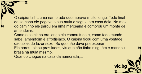 O caipira tinha uma namorada que morava muito longe. Todo final de semana ele pegava a sua mula e seguia pra casa dela. No meio do caminho ele parou em uma mercearia e comprou um monte de amendoins.