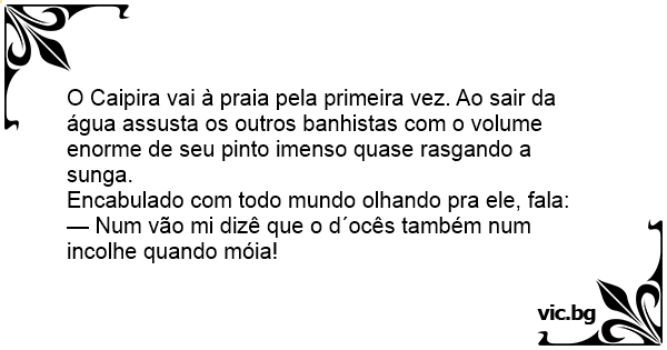 O Caipira vai à praia pela primeira vez. Ao sair da água assusta os outros banhistas com o volume enorme de seu pinto imenso quase rasgando a sunga.