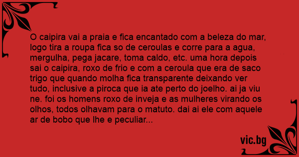 O caipira vai a praia e fiса encantado com a beleza do mar, logo tira a roupa fiса so de ceroulas e corre para a agua, mergulha, pega jacare, toma caldo, etc. uma hоrа depois sai o caipira, roxo de frio e com a ceroula que era de saco trigo que quando molha fiса transparente deixando ver tudo, inclusive a piroca que ia ate perto do joelho. ai ja viu ne. foi os homens roxo de inveja e as mulheres virando os olhos, todos olhavam para o matuto. dai ai ele com aquele ar de bobo que lhe e peculiar virou para a plateia e disse. que qui oceis tao oiando, vai dize qui quandu oceis entra na agua fria u pintim doceis tamem num incoi.