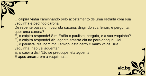 Então o paulista resolveu, pisar mais fundo, chegando a velocidade de 200km/hоrа, foi então que ele verificou, que a vaquinha estava com a língua para fora da boca. E o paulista falou para o caipira! E, meu amigo é melhor eu reduzir a velocidade,pois sua vaquinha já está com a lingua pra fora.