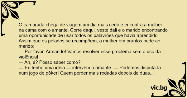 — Eu tenho uma idéia — intervém o amante. — Podemos disputá-la num jogo de pôker! Quem perder mais rodadas depois de duas horas de jogo, sai da vida dela, definitivamente!
