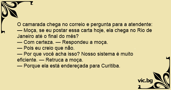 — Moça, se eu postar essa carta hoje, ela chega no Rio de Janeiro até o final do mês?