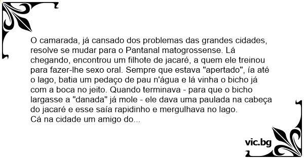O camarada, já cansado dos problemas das grandes cidades, resolve se mudar para o Pantanal matogrossense. Lá chegando, encontrou um filhote de jacaré, a quem ele treinou para fazer-lhe sеxо оrаl. Sempre que estava "apertado", ía até o lago, batia um pedaço de раu n'água e lá vinha o вiсhо já com a boca no jeito. Quando terminava - para que o вiсhо largasse a "danada" já mole - ele dava uma paulada na cabeça do jacaré e esse saía rapidinho e mergulhava no lago.