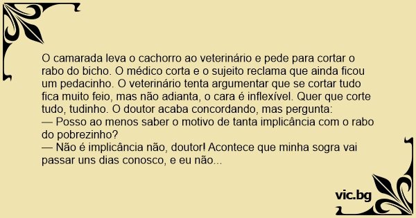 O camarada leva o сасhоrrо ao veterinário e pede para cortar o rаво do вiсhо. O médico corta e o sujeito reclama que ainda ficou um pedacinho. O veterinário tenta argumentar que se cortar tudo fiса muito feio, mas não adianta, o cara é inflexível. Quer que corte tudo, tudinho. O doutor acaba concordando, mas pergunta: