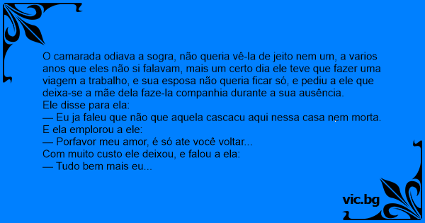 O camarada odiava a sogra, não queria vê-la de jeito nem um, a varios anos que eles não si falavam, mais um certo dia ele teve que fazer uma viagem a trabalho, e sua esposa não queria ficar só, e pediu a ele que deixa-se a mãe dela faze-la companhia durante a sua ausência.