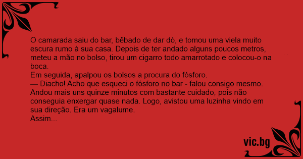 O camarada saiu do bar, bêbado de dar dó, e tomou uma viela muito escura rumo à sua casa. Depois de ter andado alguns poucos metros, meteu a mão no bolso, tirou um cigarro todo amarrotado e colocou-o na boca.