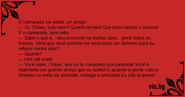 — Você sabe, Otávio, que eu te considero pra caramba! Você é realmente um grande amigo que eu tenho! E quando a gente coloca dinheiro no meio da amizade, estraga a amizade! Eu não ia querer estragar a nossa amizade só por causa de mil reais.