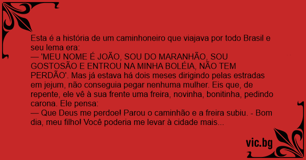 — 'MEU NOME É JOÃO, SOU DO MARANHÃO, SOU GOSTOSÃO E ENTROU NA MINHA BOLÉIA, NÃO TEM PERDÃO'. Mas já estava há dois meses dirigindo pelas estradas em jejum, não conseguia pegar nenhuma mulher. Eis que, de repente, ele vê à sua frente uma freira, novinha, bonitinha, pedindo carona. Ele pensa: