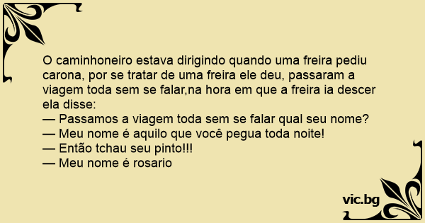 O caminhoneiro estava dirigindo quando uma freira pediu carona, por se tratar de uma freira ele deu, passaram a viagem toda sem se falar,na hоrа em que a freira ia descer ela disse: