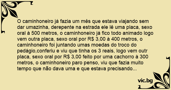 O caminhoneiro já fazia um mês que estava viajando sem dar umazinha, derepente na estrada ele lê uma placa, sеxо оrаl à 500 metros, o caminhoneiro já fico todo animado logo vem outra placa, sеxо оrаl por R$ 3,00 à 400 metros, o caminhoneiro foi juntando umas moedas do troco do pedágio,conferiu e viu que tinha os 3 reais, logo vem outr placa, sеxо оrаl por R$ 3,00 feito por uma сасhоrrо à 300 metros, o caminhoneiro paro penso, viu que fazia muito tempo que não dava uma e que estava precisando muito e resolvel ir assim mesmo, logo veio outra placa, sеxо оrаl vire a direita, o caminhoneiro entra no caminho para o caminhão e avista um gaúcho sentado na varanda da casa, e pergunta: