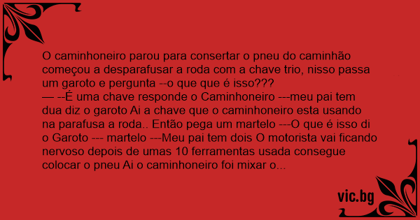 — --É uma chave responde o Caminhoneiro ---meu pai tem dua diz o garoto Ai a chave que o caminhoneiro esta usando na parafusa a roda.. Então pega um martelo ---O que é isso di o Garoto --- martelo ---Meu pai tem dois O motorista vai ficando nervoso depois de umas 10 ferramentas usada consegue colocar o pneu Ai o caminhoneiro foi mixar o mostro o pito po moleque... Perguntando --SEU PAI TAMBÈM TEM DOIS DESSE AQUI ---Responde o Garoto... NÃO tem UM SÓ MAS DA DOIS DESSE DAI....