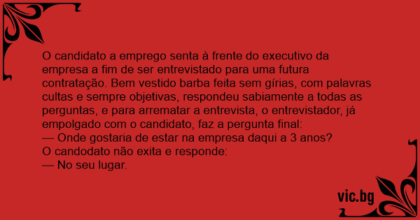 O candidato a emprego senta à frente do executivo da empresa a fim de ser entrevistado para uma futura contratação. Bem vestido barba feita sem gírias, com palavras cultas e sempre objetivas, respondeu sabiamente a todas as perguntas, e para arrematar a entrevista, o entrevistador, já empolgado com o candidato, faz a pergunta final: