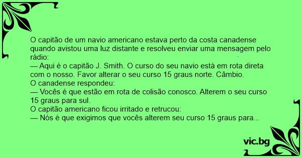 — Aqui é o capitão J. Smith. O curso do seu navio está em rota direta com o nosso. Favor alterar o seu curso 15 graus norte. Câmbio.