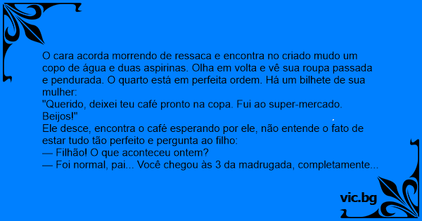 — Foi normal, pai... Você chegou às 3 da madrugada, completamente bêbado, vomitou no tapete da sala, quebrou alguns móveis, mijou no guarda-roupa e machucou teu olho ao bater na porta do quarto.
