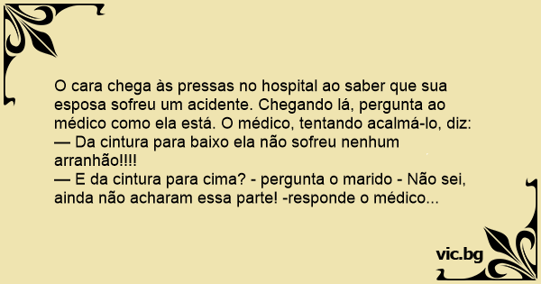 O cara chega às pressas no hospital ao saber que sua esposa sofreu um acidente. Chegando lá, pergunta ao médico como ela está. O médico, tentando acalmá-lo, diz: