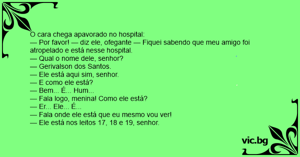 — Por favor! — diz ele, ofegante — Fiquei sabendo que meu amigo foi atropelado e está nesse hospital.