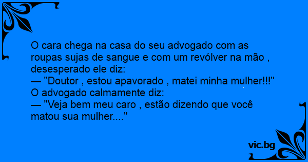 O cara chega na casa do seu advogado com as roupas sujas de sangue e com um revólver na mão , desesperado ele diz: