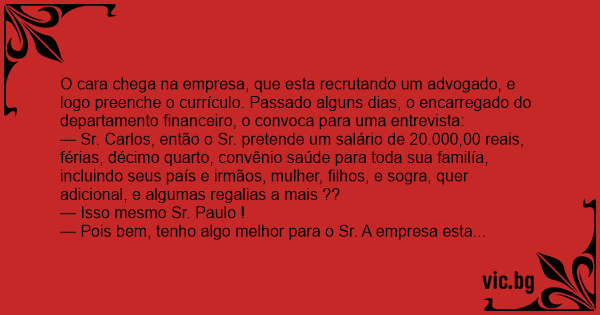 O cara chega na empresa, que esta recrutando um advogado, e logo preenche o currículo. Passado alguns dias, o encarregado do departamento financeiro, o convoca para uma entrevista: