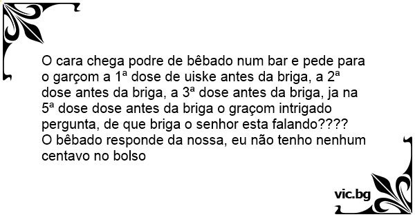 O cara chega podre de bêbado num bar e pede para o garçom a 1ª dose de uiske antes da briga, a 2ª dose antes da briga, a 3ª dose antes da briga, ja na 5ª dose dose antes da briga o graçom intrigado pergunta, de que briga o senhor esta falando????