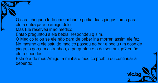 No mesmo q ele saiu do medico passou no bar e pediu um dose de pinga, o garçom estranhou, e perguntou e a de seu amigo? então ele respondeu: