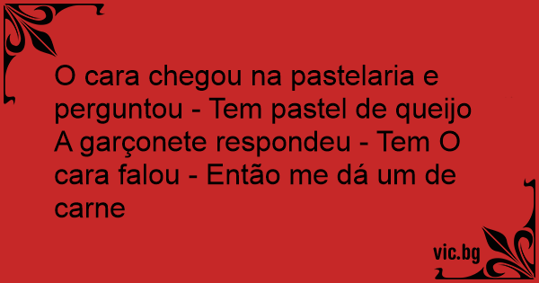 O cara chegou na pastelaria e perguntou - Tem pastel de queijo A garçonete respondeu - Tem O cara falou - Então me dá um de carne