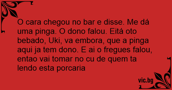 O cara chegou no bar e disse. Me dá uma pinga. O dono falou. Eitá oto bebado, Uki, va embora, que a pinga aqui ja tem dono. E ai o fregues falou, entao vai tomar no cu de quem ta lendo esta porcaria