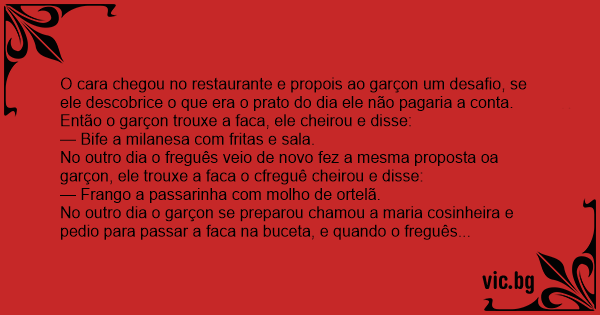 No outro dia o garçon se preparou chamou a maria cosinheira e pedio para passar a faca na вuсета, e quando o freguês chegou ele foi logo trazendo a faca. O freguês cheirou... cheirou... e falou: