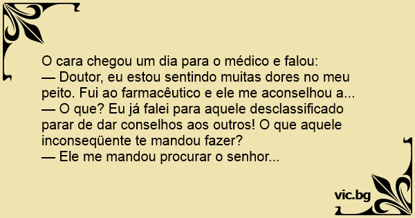 — Doutor, eu estou sentindo muitas dores no meu peito. Fui ao farmacêutico e ele me aconselhou a...