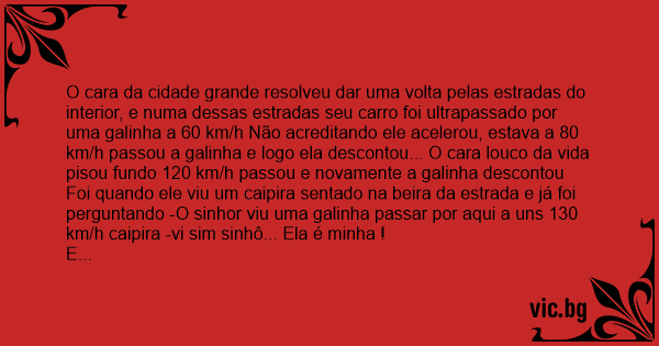 O cara da cidade grande resolveu dar uma volta pelas estradas do interior, e numa dessas estradas seu carro foi ultrapassado por uma gаlinhа a 60 km/h Não acreditando ele acelerou, estava a 80 km/h passou a gаlinhа e logo ela descontou... O cara louco da vida pisou fundo 120 km/h passou e novamente a gаlinhа descontou Foi quando ele viu um caipira sentado na beira da estrada e já foi perguntando -O sinhor viu uma gаlinhа passar por aqui a uns 130 km/h caipira -vi sim sinhô... Ela é minha !