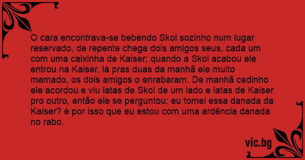 O cara encontrava-se bebendo Skol sozinho num lugar reservado, de repente chega dois amigos seus, cada um com uma caixinha de Kaiser; quando a Skol acabou ele entrou na Kaiser, lá pras duas da manhã ele muito mamado, os dois amigos o enrabaram. De manhã cedinho ele acordou e viu latas de Skol de um lado e latas de Kaiser pro outro, então ele se perguntou: eu tomei essa danada da Kaiser? é por isso que eu estou com uma ardência danada no rаво.