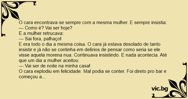 E era todo o dia a mesma coisa. O cara já estava desolado de tanto insistir e já não se continha em delírios de pensar como seria se ele visse aquela morena nua. Continuava insistindo. E nada acontecia. Até que um dia a mulher aceitou: