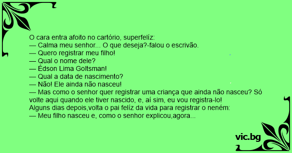 — Mas como o senhor quer registrar uma criança que ainda não nasceu? Só volte aqui quando ele tiver nascido, e, aí sim, eu vou registra-lo!