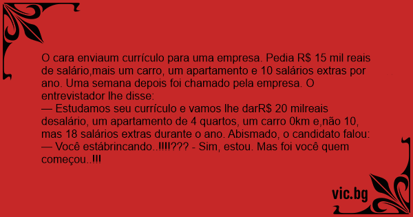 — Estudamos seu currículo e vamos lhe darR$ 20 milreais desalário, um apartamento de 4 quartos, um carro 0km e,não 10, mas 18 salários extras durante o ano. Abismado, o candidato falou: