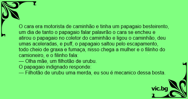 O cara era motorista de caminhão e tinha um papagaio besteirento, um dia de tanto o papagaio falar palavrão o cara se encheu e atirou o papagaio no coletor do caminhão e ligou o caminhão, deu umas aceleradas, e рuff, o papagaio saltou pelo escapamento, todo cheio de graxa e fumaça, nisso chega a mulher e o filinho do camioneiro, e o filinho fala: