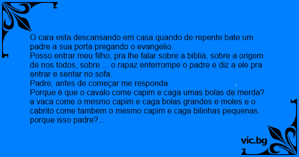 Porque é que o cavalo come capim e caga umas bolas de меrdа? a vаса come o mesmo capim e caga bolas grandes e moles e o cabrito come tambem o mesmo capim e caga bilinhas pequenas. porque isso padre?