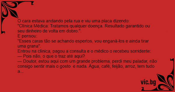— Doutor, estou aqui com um grande problema, perdi meu paladar, não consigo sentir mais o gosto e nada. Água, café, feijão, arroz, tem tudo a mesma falta de gosto.