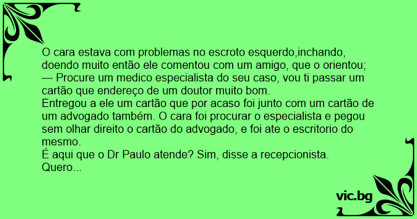 Entregou a ele um cartão que por acaso foi junto com um cartão de um advogado também. O cara foi procurar o especialista e pegou sem olhar direito o cartão do advogado, e foi ate o escritorio do mesmo.