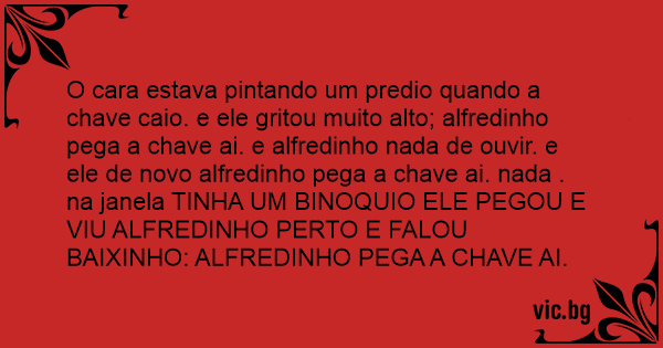 O cara estava pintando um predio quando a chave caio. e ele gritou muito alto; alfredinho pega a chave ai. e alfredinho nada de ouvir. e ele de novo alfredinho pega a chave ai. nada . na janela TINHA UM BINOQUIO ELE PEGOU E VIU ALFREDINHO PERTO E FALOU BAIXINHO: ALFREDINHO PEGA A CHAVE AI.