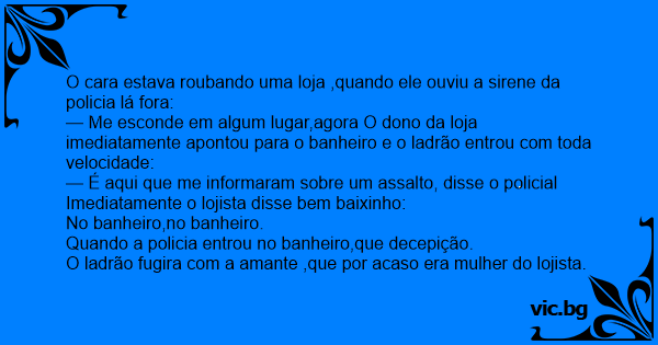 — Me esconde em algum lugar,agora O dono da loja imediatamente apontou para o banheiro e o ladrão entrou com toda velocidade: