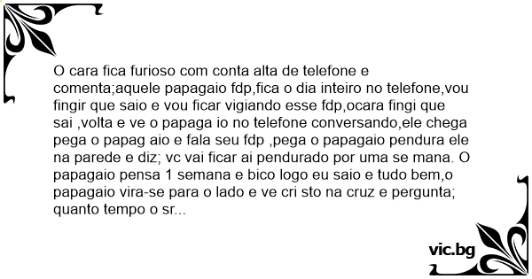 O cara fiса furioso com conta alta de telefone e comenta;aquele papagaio fdp,fiса o dia inteiro no telefone,vou fingir que saio e vou ficar vigiando esse fdp,ocara fingi que sai ,volta e ve o papaga io no telefone conversando,ele chega pega o papag aio e fala seu fdp ,pega o papagaio pendura ele na parede e diz; vc vai ficar ai pendurado por uma se mana. O papagaio pensa 1 semana e bico logo eu saio e tudo bem,o papagaio vira-se para o lado e ve cri sto na cruz e pergunta; quanto tempo o sr esta ai cristo responde; 2000 anos. o papagaio exclama;